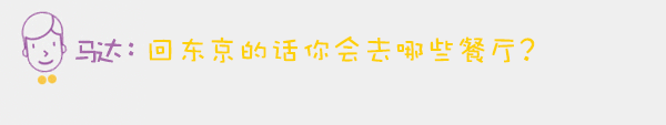雪崴:日本料理是首选,烧鸟店和小一点的居酒屋。我一个人吃饭比较随意,原则就是离自己住的地方或者餐厅近一点,店附近的鸟屯就会去,比较方便。