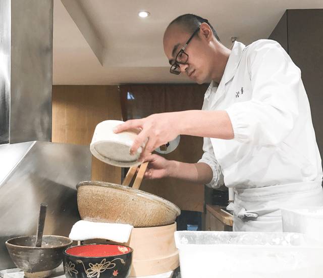 当我们扛着机器进到雪崴店里,这些侧面逐渐和他本人重叠到一起,褪去了标签的刻板。除去料理之外,餐厅装潢应该最能体现料理人风格了。冯唐写的菜单,德田八十吉的「一期一会」,一柜子的食器,都是问起来才说的,没有特意张扬。L 型的吧台除了整洁的碟子之外没有过多装饰,很明显,食物是这里的主角。