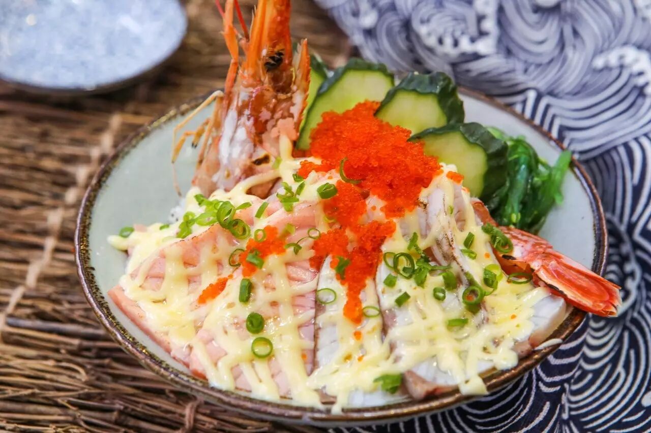 三文鱼、熟虾、蟹柳、帆立贝、溏心蛋