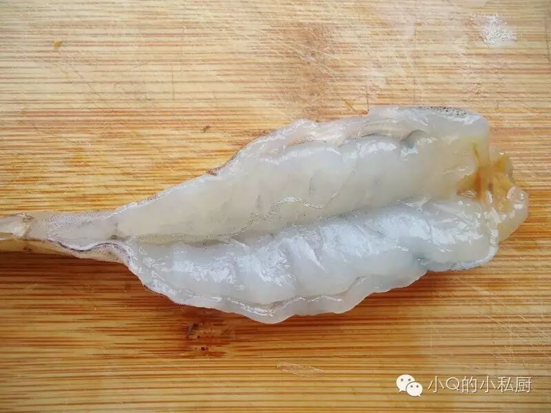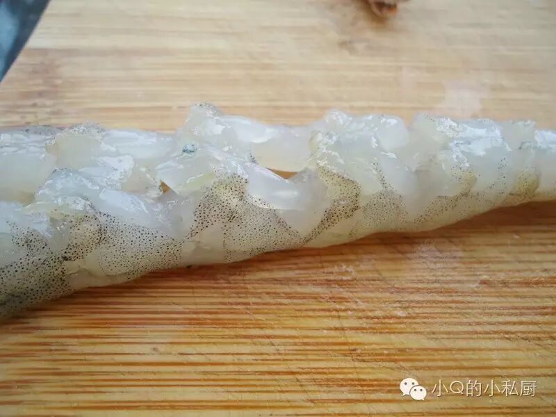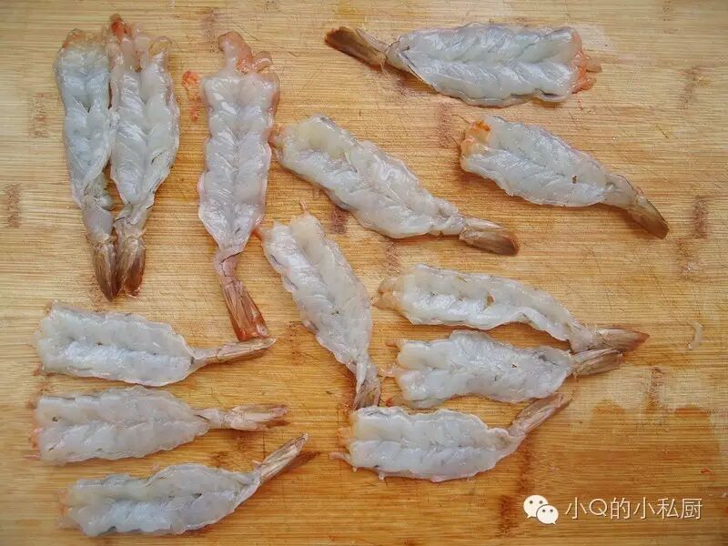然后翻过来 垂直于虾身的方向 划几刀 但不要切断 这样能炸出不弯曲的虾