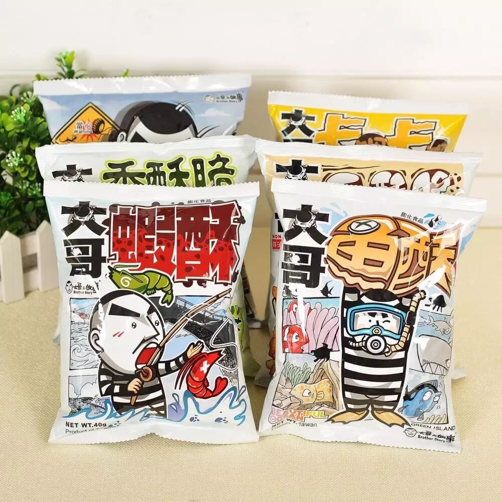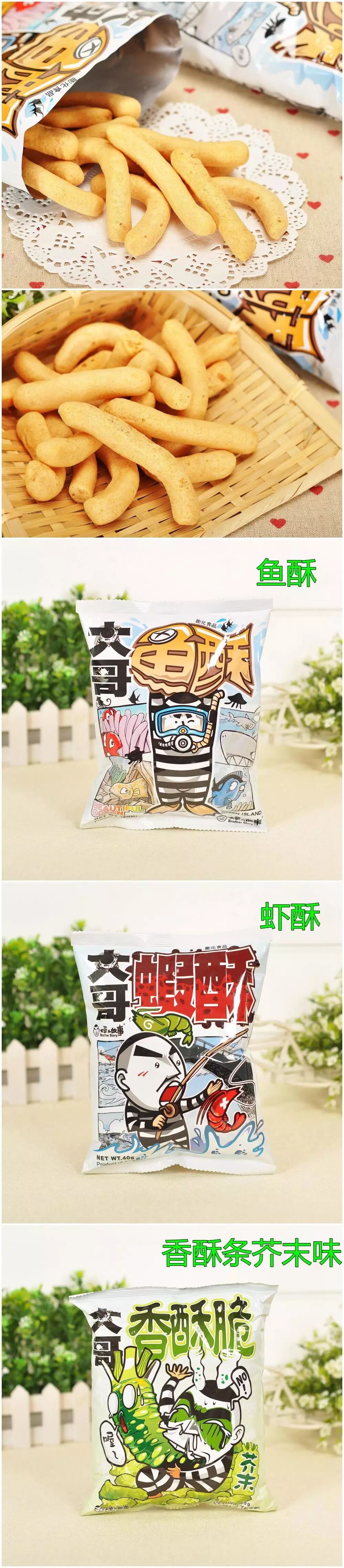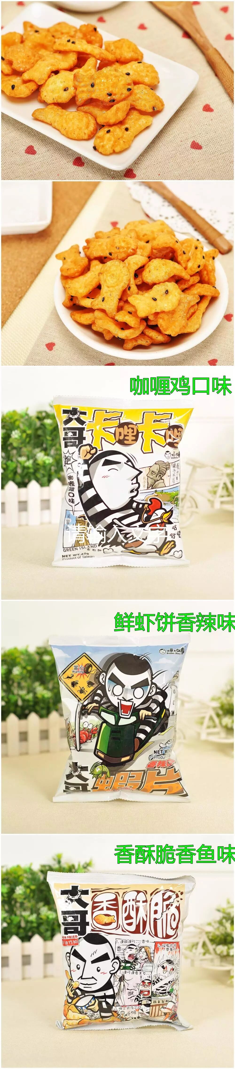 大哥的故事 卡哩卡哩(咖喱鸡口味)45g大哥的故事 香脆酥(香鱼口味)52g大哥的故事 鱼酥 40g大哥的故事 虾酥 45g大哥的故事 鲜虾饼(香辣口味)45g大哥的故事 香脆酥(芥末口味)45g