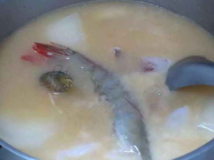 3、加入海鲜、加米酒。小滚煮海鲜,千万别大火煮海鲜,大火煮肉质会变硬、变老。