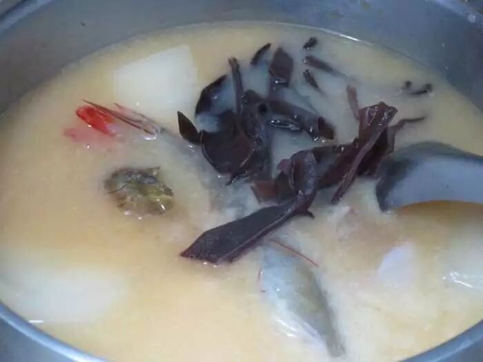 2、取深锅煮白萝卜汤加姜,煮至白萝卜软。味增放到滤网在汤里拌散。如图