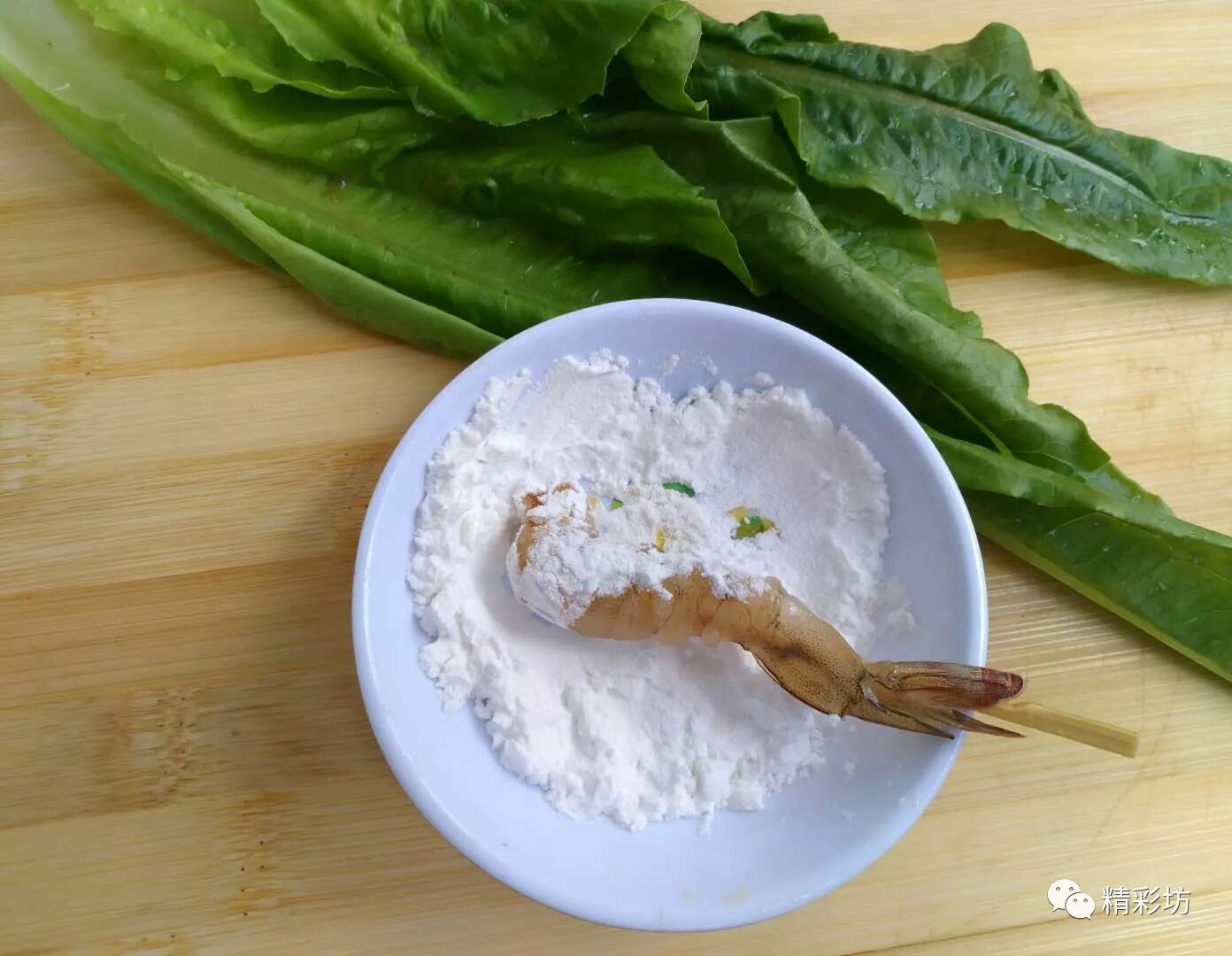 将虾体依次裹上蛋清和生粉(也可以裹鸡蛋和面粉调成的糊,糊放点盐、胡椒粉和生抽味道更好)