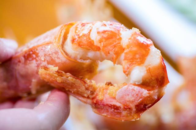 高温油炸一分钟,锁住原汁原味。剥虾的时候就噼里啪啦地响,一边剥一边吞咽口水。