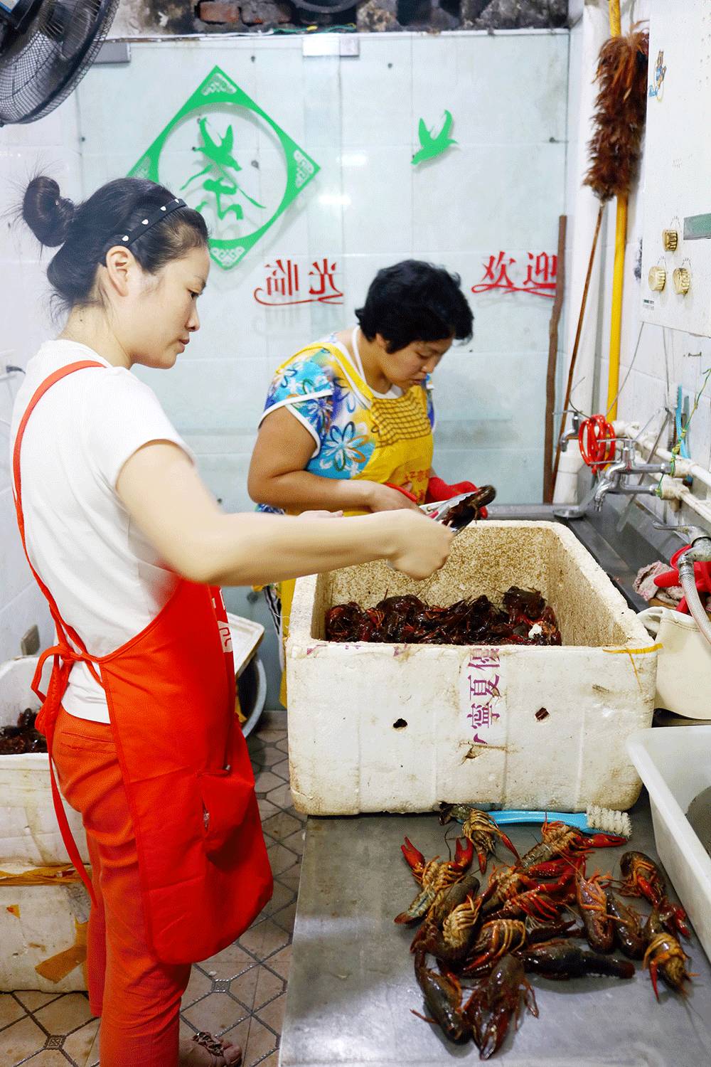 每天,“虾皇传奇”的服务员都会检查龙虾的新鲜度,如果有死掉的小龙虾就会立马扔进垃圾桶,绝不会入锅上桌端给客户。