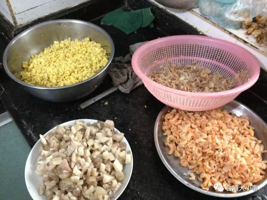 接下来就是盖籺的陷,馅料一般有:有猪肉、虾米、沙虫、木耳、芹菜、竹笋等,然后把这些馅料炒熟。说到这,会有两种做法——第一种是等全部的米浆蒸熟之后,再在上面铺上馅料;第二种是,蒸一层米浆、铺一层馅料......如此循环。笔者个人比较喜欢第二种做法,因为料够足,吃起来就是豪华至尊版的享受。