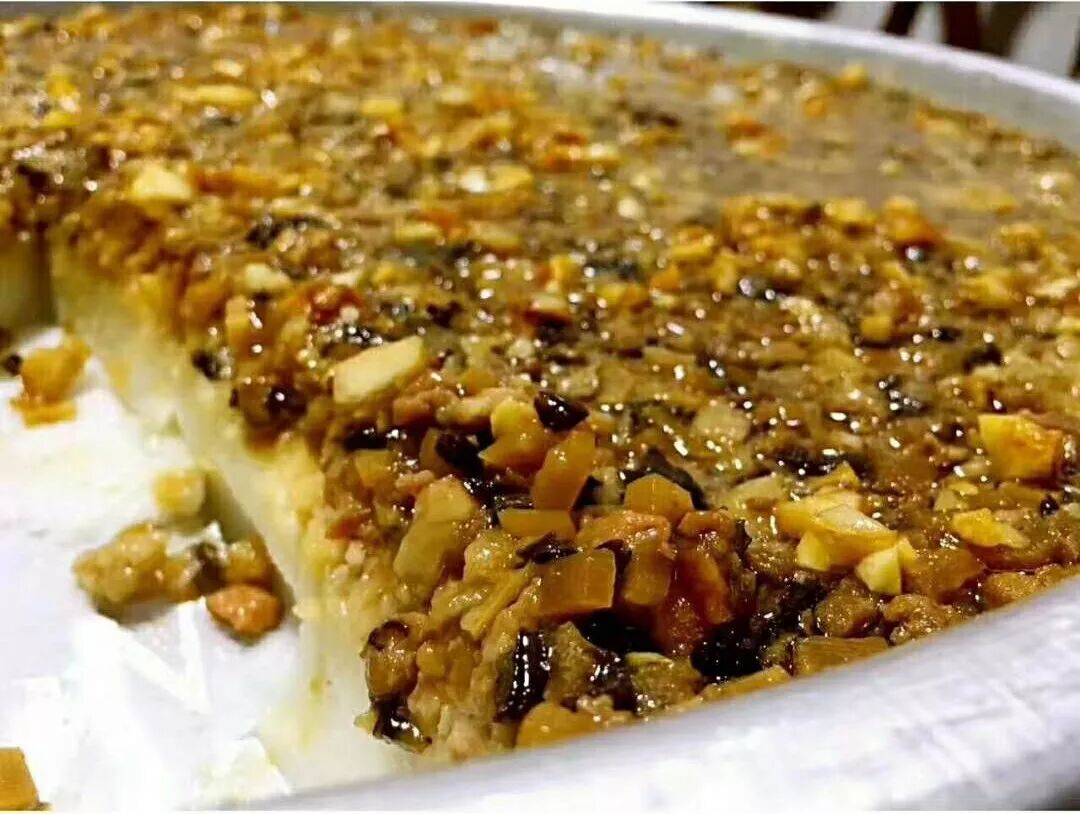 最后,盖籺炊好之后,吃法是这样的,用一把弯弯的像割禾的镰刀一样的小道片,把盖籺切成几十个小方块,淋上秘制独特的酱料,盖籺的酱料一般是:酱油、拍碎的蒜米、香油调配成的酱,这是最原始的吃法,不过也是最好吃的吃法!现在大家会根据自身的口味,制作了其他口味的酱,比如说酸甜酱、咸辣酱等。不过,作为吃货的笔者,感情比较专一,还是比较喜欢蒜蓉酱油的吃法!因为是一层一层地淋上米水,所以盖米乙也是一层一层的结构,一口要下去,简直就是鲜嫩爽滑,超爽!