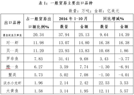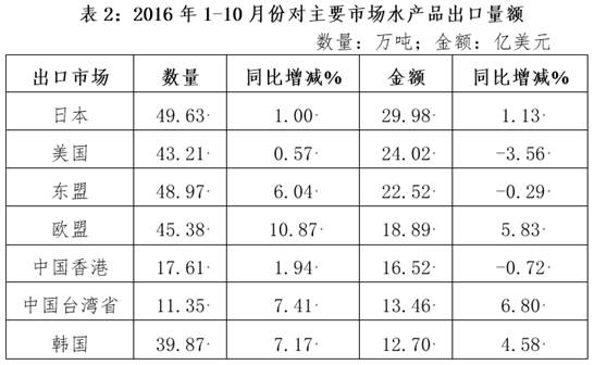 今年1-10月,我国水产品对主要市场出口量和出口额结束了去年同比均降的疲软状态,对外贸易基本止跌,除对美国、东盟和香港出口额略有下降外,其他市场出口量额有明显增长。