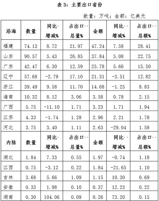 出口省份中,福建、山东、广东、辽宁、浙江、河北、海南、广西等沿海省份仍是我水产品主要出口省份,出口额之和占全国水产品出口总额的99.13%。