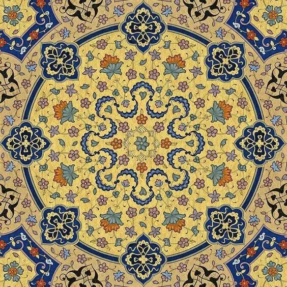 伊斯兰的几何纹样,更是断然独创的东西,由于无始无终的折线组合,转瞬间即现出了无限变种,与几何纹和花纹结合更构成了特殊的形态。并且以一个纹样为单位,反复连续使用即构成了著名的阿拉伯式花样。
