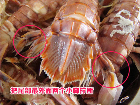 1. 把尾部最外面两个小脚拧断,然后捏着尾部轻轻往上一折,再拧掉。
