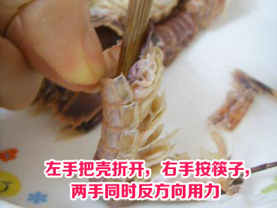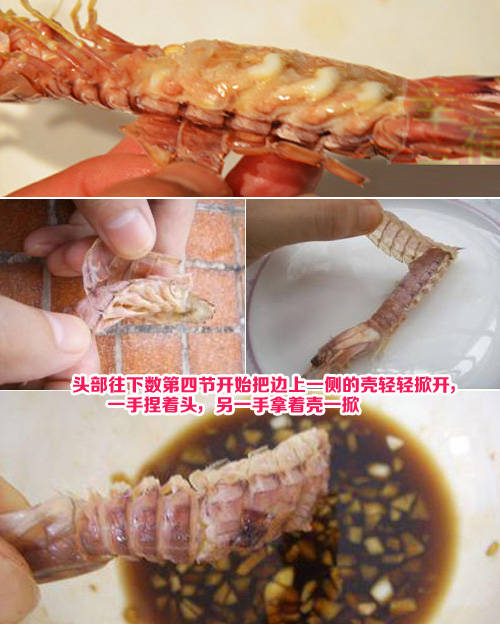 从头部开始往下数第四节开始把边上一侧的壳轻轻掀开,一手捏着头,另一手拿着壳一掀就搞定了。怎么现在才看到这个,这么多年,我是浪费了多少肉肉~!吃货们赶紧get新技能吧!哈哈