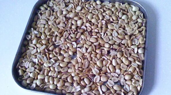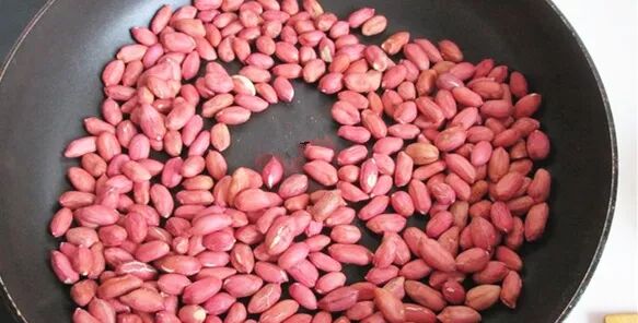 2、将花生倒入锅内炒熟。盛出。