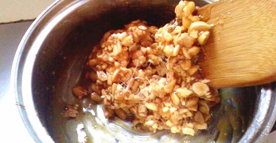 6、这时马上把花生仁倒入迅速搅拌均匀,然后倒入模具里面压平。