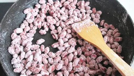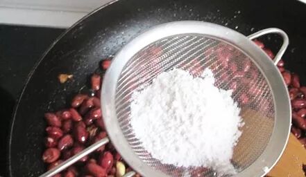 5、倒入炒制好的花生米,让每粒花生都裹上糖浆,然后筛入淀 粉。