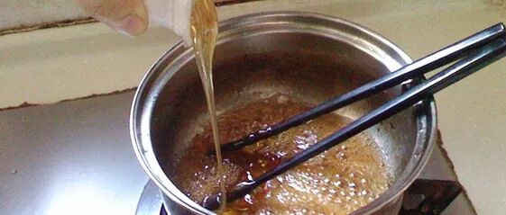 2、熬糖时一定不要心急,火不能大,否则糖就变成深红色甚至会糊。