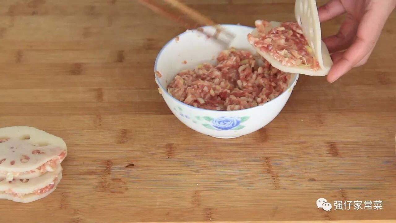 5.把上劲好的肉馅酿到藕夹里面,然后用手稍微捏一下,防止肉馅脱落