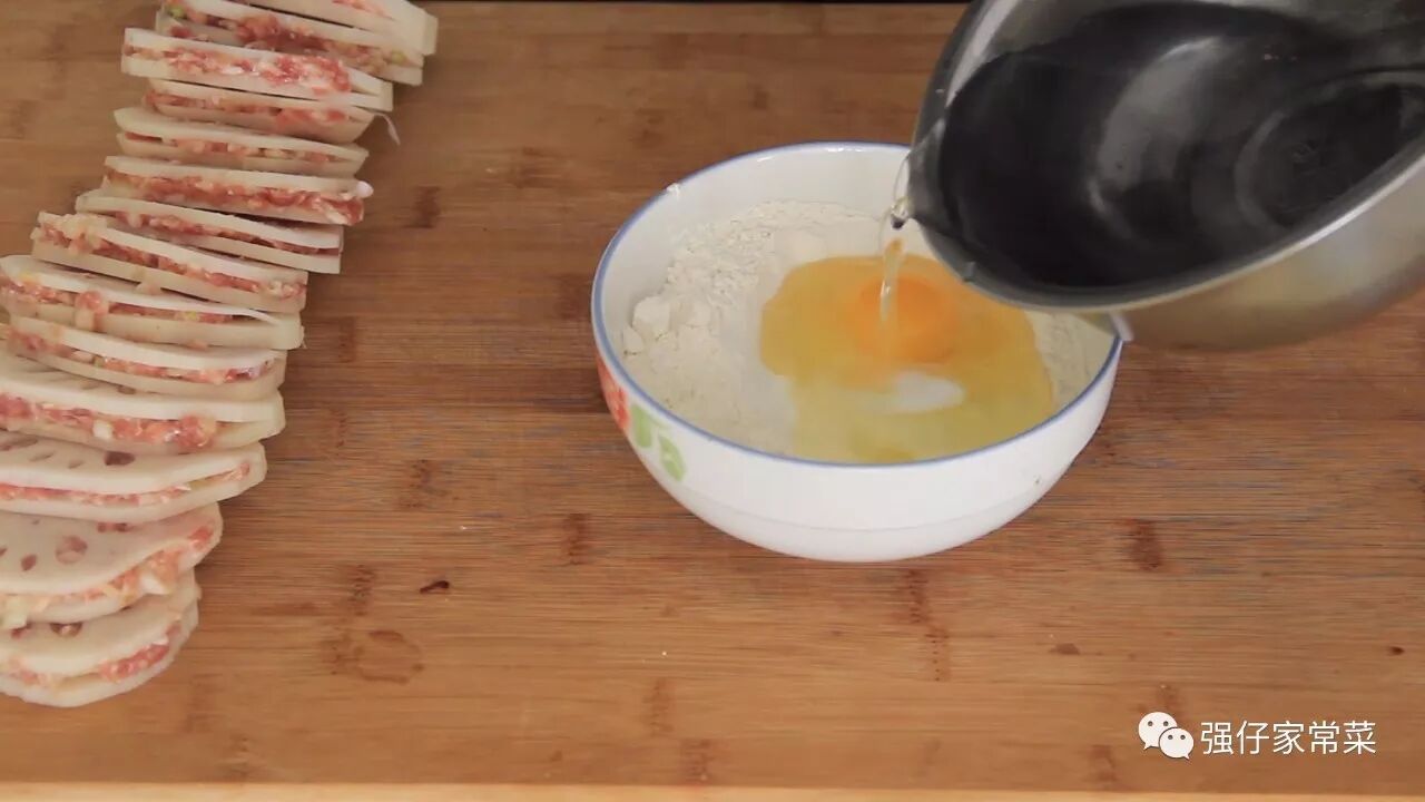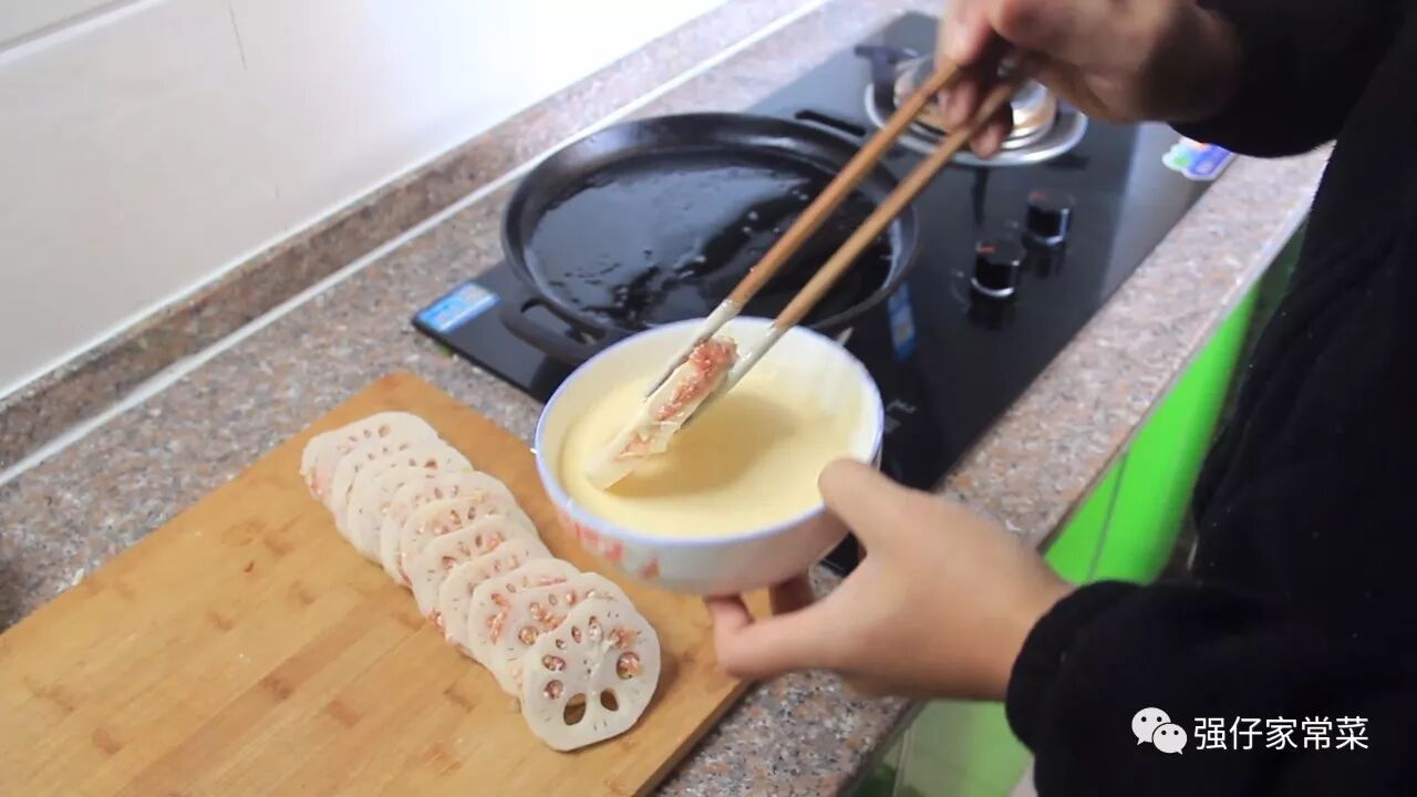 7.锅烧干后淋上适量油,然后先把藕夹沾上一层面粉糊,再下入锅中,开小火煎