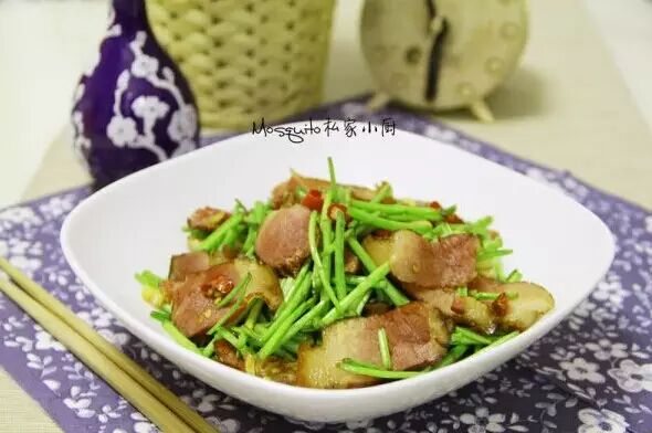 6.加入盐(少量是因为腊肉本身是咸的)、料酒、生抽,翻炒1分钟后出锅。盛盘即可。