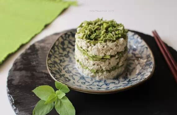 5.再铺一层香椿 然后重复 直至铺满模具 用手轻按顶部 让香椿和豆腐更紧密一些,然后轻轻脱模