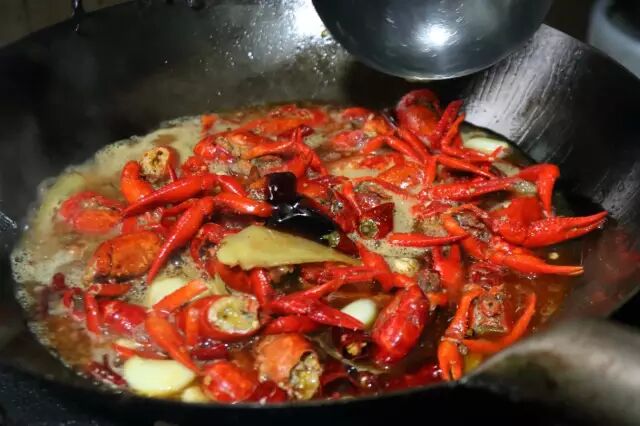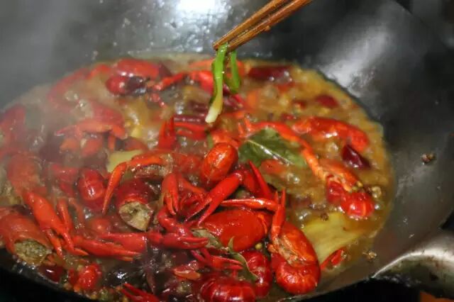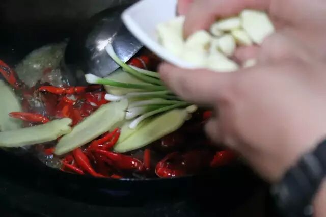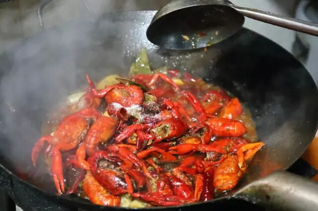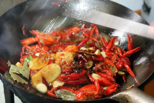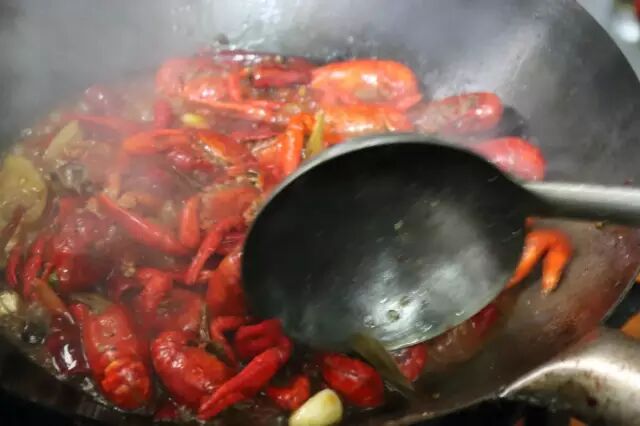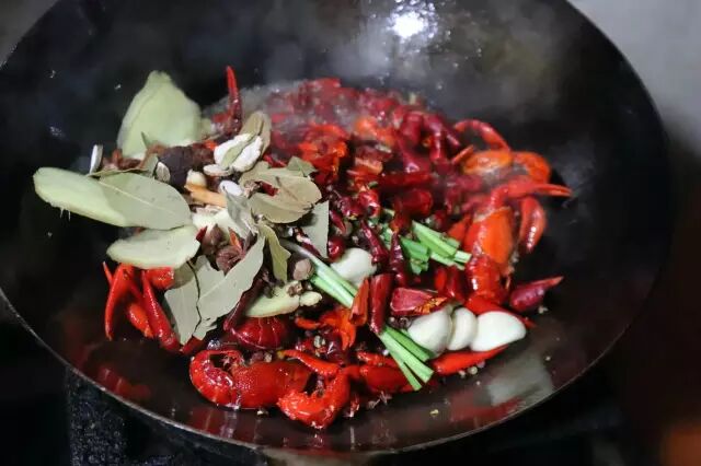 龙虾外壳基本变红,虾子尾巴裂开后下入香料,干辣椒,花椒,葱姜蒜,炒10秒钟,然后加豆瓣再炒15秒,炒出豆瓣香味。如果是家里做,火小的话炒的时间长点。
