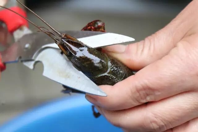 全部刷完了再用清水过几遍了就可以开始剪虾子了,头先减掉,里面的一些脏东西弄掉,注意不要把虾黄搞掉了