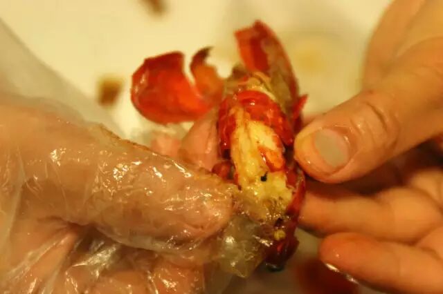 解开红肚兜(撕开龙虾的腹节);