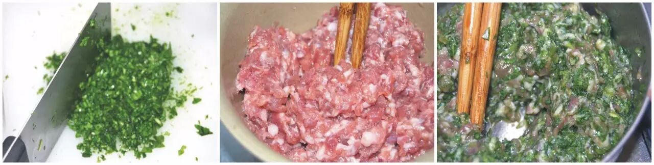 4. 荠菜择去黄叶剪去根须洗净,入沸水锅中焯一下捞出立刻浸入冷水降温;将降温后的荠菜稍挤水分后切碎备用。