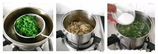4.炒锅烧热,倒入油烧热,下肉丝煸炒至变色盛出。 另起油锅烧热后,下荠菜末煸炒变色,加入一碗高汤或清水烧开。