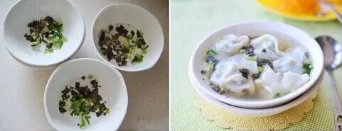 ⑤ 大碗里放上适量紫菜碎、葱花、一点点盐和芝麻油,将煮好的馄饨连汤带水一起盛进碗里就可以吃了。