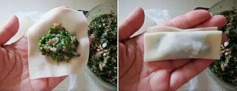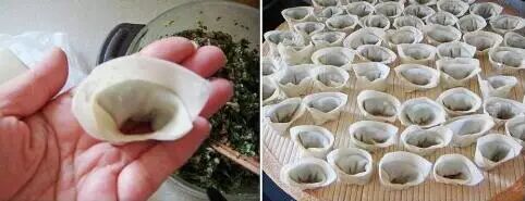④ 两个下角对折捏在一起成元宝状,一个馄饨就包好了,所有的馄饨包好以后烧开水煮熟;