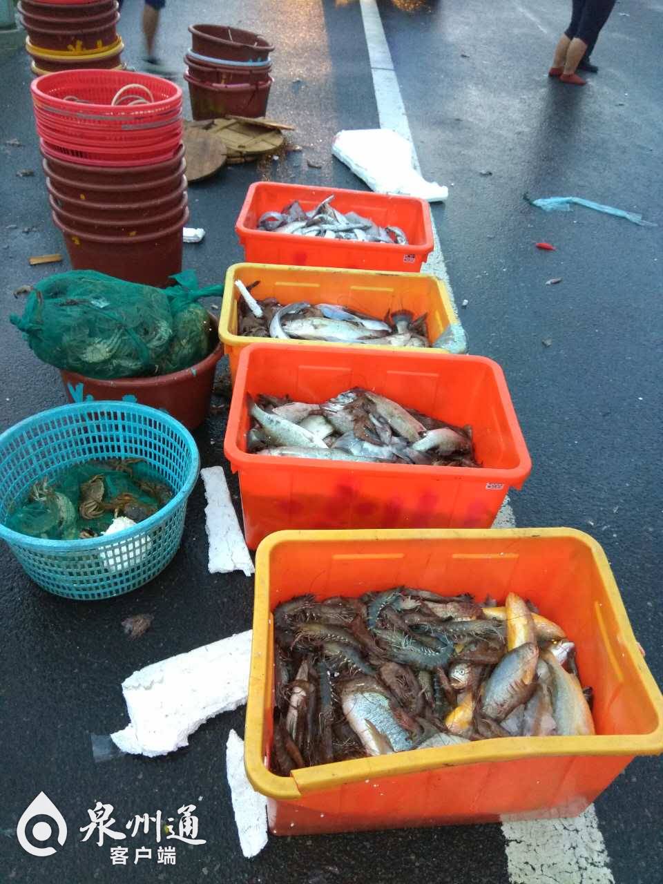 记者从泉州高速交警支队二大队一中队曾志伟副中队长处了解到,事故发生在昨日凌晨5时左右。当时,曾志伟接到指挥中心派警,说在辖区路段有事故发生,便立即出警。在现场,曾志伟发现,高速公路上满是仓鱼、带鱼、九节虾、蟹等海鲜,撒了一地。驾驶员黄某称,其驾驶轻型普通货车从泉州水产市场出发,车子开到了泉南高速A道(泉州往三明方向)8公里+500米处时,这辆运载海鲜的轻型货车侧翻在第二车道和第三车道之间,整车的海鲜则散落在二三车道和应急车道上。