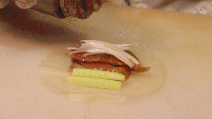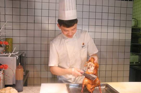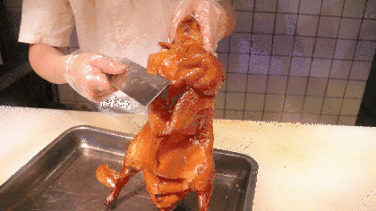 每一只鸭子都是从吊炉里面拿出来的,新鲜之余香味也是引人前来的巨大原因~偷偷告诉你们,片鸭子的小哥长得很不错!