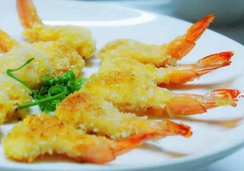 500g基围虾、油、盐、面包糠、玉米淀粉、 1颗鸡蛋、黑胡椒粉、少许白醋