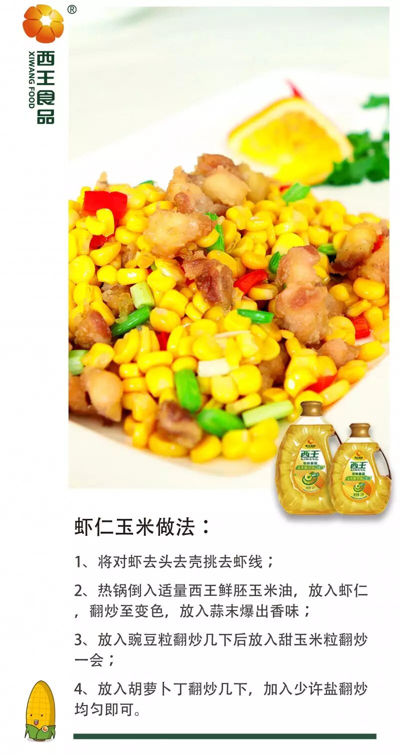 虾中含有20%的蛋白质,是蛋白质含量很高的食品之一,而且和鱼肉禽肉相比,脂肪含量少。配上营养丰富的玉米粒,营养均衡鲜甜可口。用清淡纯正富含维生素E的西王鲜胚玉米油烹制,不仅能凸显这道菜的美味鲜甜可口特色而且营养更丰富哦。