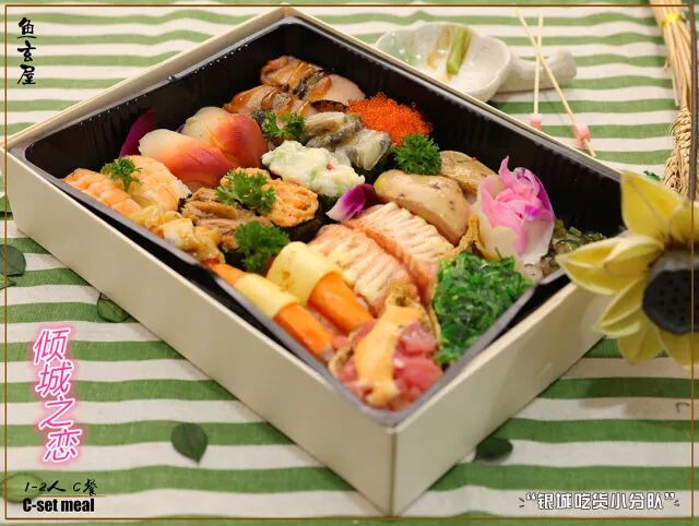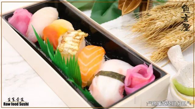 由鲜虾握、三文鱼握、金枪鱼握、鳗鱼握、蟹柳握,组合而成的色泽鲜美,口感细腻。吃寿司一定要一整口吃下一块寿司,让生鱼和米饭一起在口中咀嚼,才能感受到鲜甜。