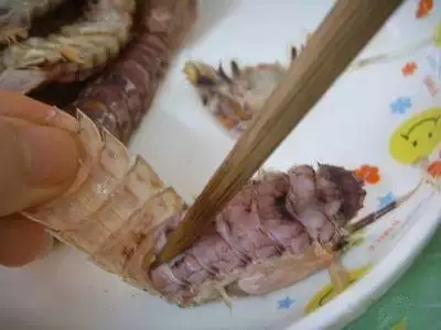 第一种方法:将尾部最外面两个小脚拧断,然后捏住尾部轻轻往上一折,再拧掉。用一条筷子从尾部贴住虾壳插到虾头附近。左手将壳折开,右手按住筷子,两手同时反方向用力。这个时候,皮皮虾背部整个壳就掀开了。