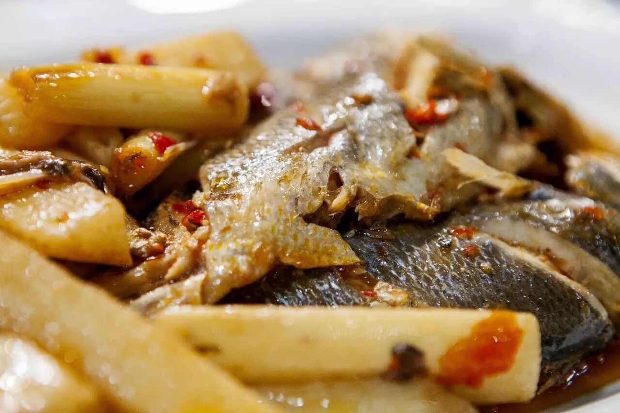 另备一口锅,热油,炒香辣酱、干辣椒、大葱、姜片,倒入黄鱼烧制,加入料酒,鸡粉、老抽、盐、白糖调味,山药入锅一起烧制入味即可起锅