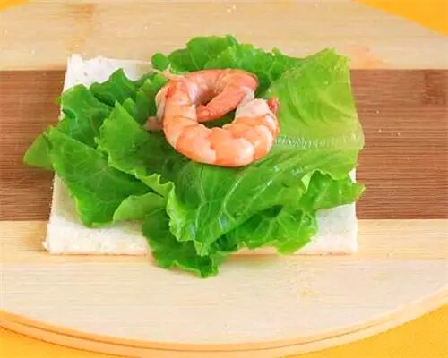 4、生菜快速焯一下,放在面包上,再放上炒好的虾仁;