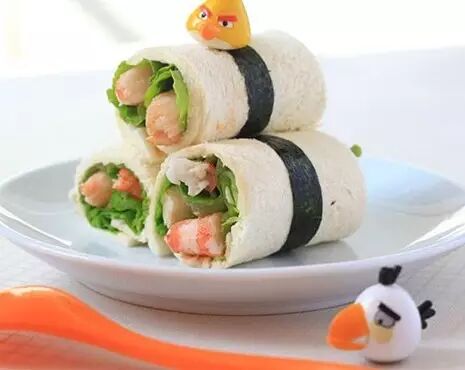 5、卷起吐司,用海苔条把土司卷固定下来,封口处用一点点凉白开捏合即可;