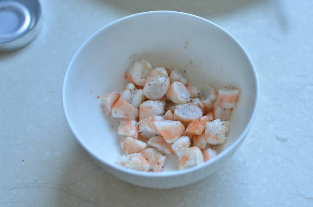 2、南瓜用微波炉加热2分钟至熟,虾仁放锅中煮熟捞出,煮熟的虾剥去外壳切成小与南瓜相同大小的块,加入盐和黑胡椒粉腌10分钟;