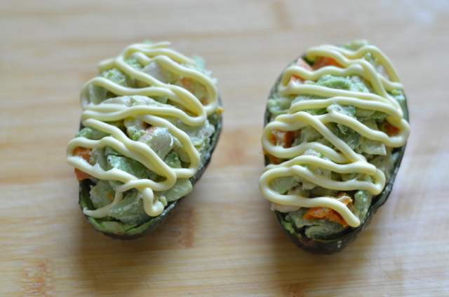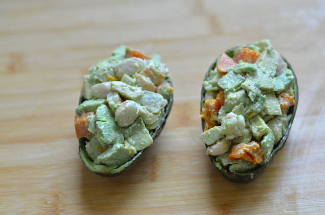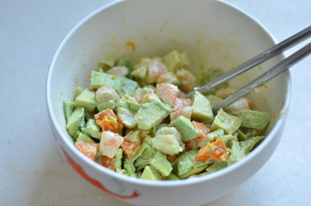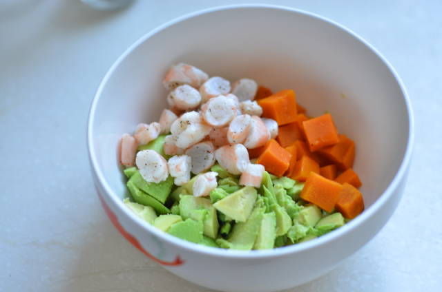 材料:牛油果(一个)、南瓜(50克)、虾仁(5个)、黑胡椒粉(少许)、蛋黄酱(少许)、盐(适量)