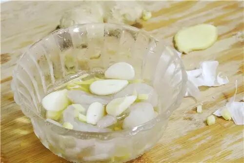 1、虾仁洗净,加蒜末、姜末、料酒、盐腌制20分钟;