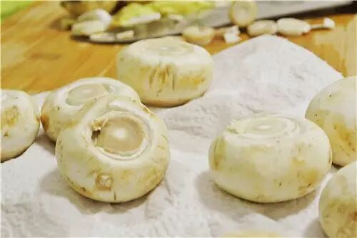 4、口蘑洗净去蒂,控干水分;平底锅小火热油,先将口蘑朝下煎一分钟后翻面,盖上盖,煎至口蘑小碗里充满液体;