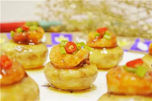 5、虾仁放口蘑小碗里,淋上茄汁,撒上少许葱末装饰,即可食用;