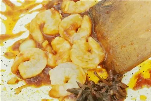 3、锅烧油,油至七成熟时,下姜末、八角、蒜末炒香,加入茄汁翻炒几下,再加入虾仁与少许盐,炒至虾仁变色,装盘备用;