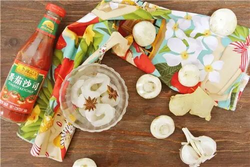 虾仁、口蘑、蒜末、姜末、醋、蚝油、盐、生粉、番茄酱、白糖、八角、葱末