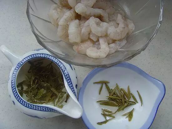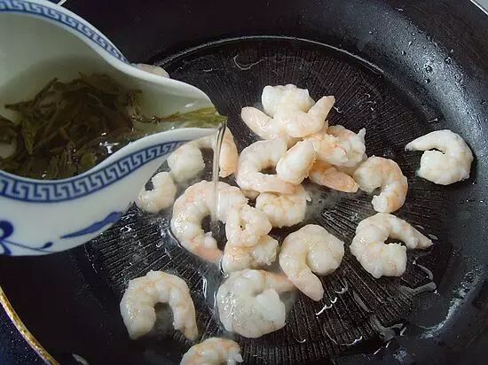 4、锅留少量底油,倒入虾仁,迅即将茶叶连汁倒入;