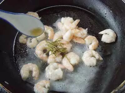 3、锅置火上待油温7成热时,下虾仁滑散,迅速出锅,以免虾仁过老;